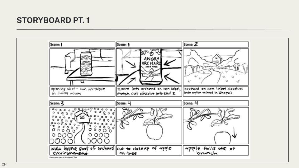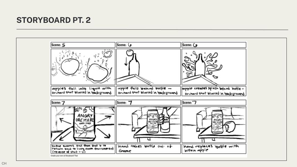 We modified our storyboard so that shot 7 now takes place within the orchard environment and is a static camera featuring an actor pouring the drink into a cup, and then picking it up, placing a bitten apple and walking off frame, where we then reveal the product logo.